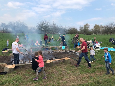 Nachdem den Kindern das Stockbrotbacken zu lange dauerte, überließen sie diese Arbeit lieber ihren Eltern und beschäftigten sich mit den kleinen Spielgeräte, die vom Orga-Team bereitgestellt worden waren. Mit Bällen, Seilchen und Frisbee sah man die Kinder über die große Wiese jagen. Auch das Schwungtuch wurde eingesetzt und fand bei den Kindern großen Anklang.