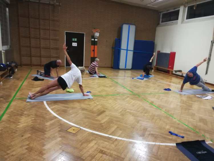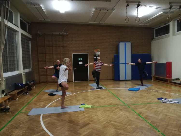 In unregelmäßigen Abständen machen wir schwerpunktmäßig Poweryoga. Das ist eine sehr anstrengende Form von Yoga, die Kräftigung und Dehnung sehr effektiv verbindet. Einzelübungen aus dem Yogazyklus werden auch sonst mit eingebaut.